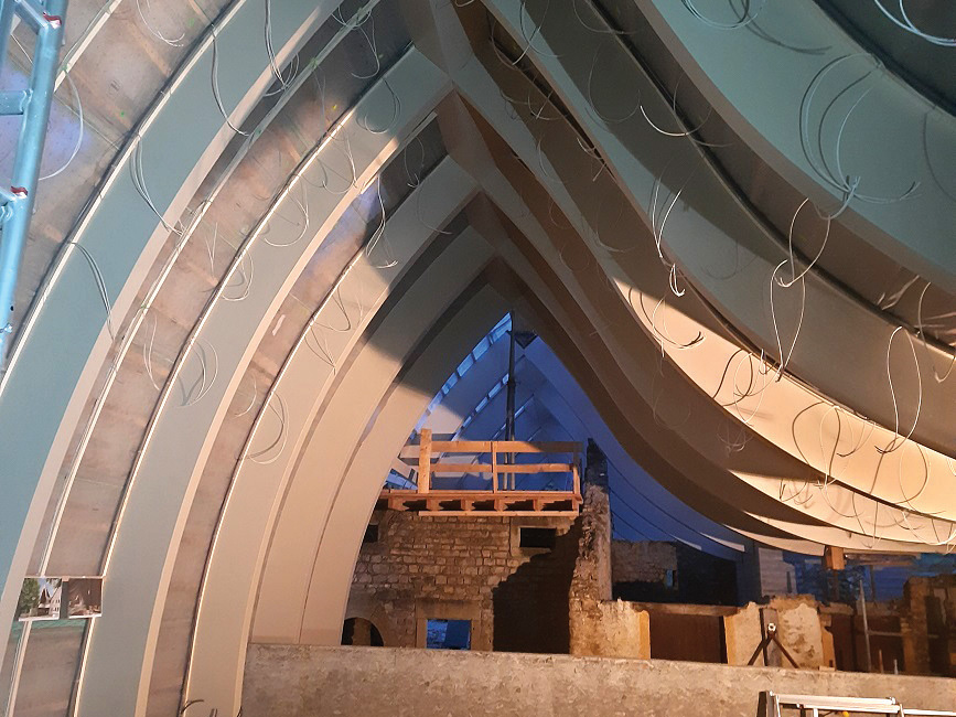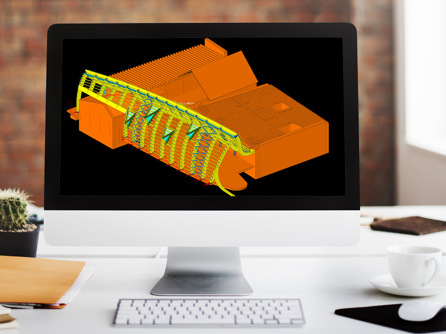 L’enjeu principal portait sur la modélisation des poutres et assemblages, ainsi que sur la rationalisation des ferrures, dans le cadre d’une structure architecturale complexe.
